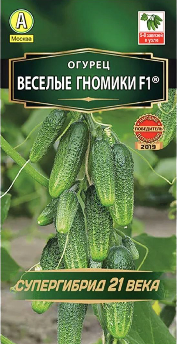 Семена Огурец Весёлые гномики F1. Высокоурожайный, ультраскороспелый, партенокарпический гибрид для открытого грунта и пленочных теплиц. Период от всходов до начала плодоношения 38-40 дней. Плод цилиндрический, мелкобугорчатый, опушение белое, длиной 8-9 см, массой 70-90 г. Вкусовые качества отличные. Гибрид пригоден для потребления в свежем виде, засолки и консервирования. Отличный вкус и внешний вид огурцов в сочетании с высокой урожайностью (12-13 кг/м2) позволяют использовать их не только для собственного потребления, но и на продажу. Агротехника. Посев семян в грунт или на рассаду. Возраст рассады при высадке – 20-30 дней. Плотность посадки в открытом грунте 4-5 растений, в теплицах 2-3 растения на 1 м2. В теплицах растения подвязывают к шпалере и формируют в один стебель. Боковые побеги прищипывают над 2-3 листом. Растениям необходимы регулярные поливы, прополки, рыхления и подкормки. Сбор плодов нужно проводить регулярно каждые 2-3 дня.