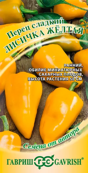 Семена Перец Лисичка желтая. Очень сладкий и ароматный миниатюрный перец на один укус. Быстро созревает (110-115 дней от всходов до первых сборов) и обильно плодоносит. Невысокий куст удобно выращивать в горшках на окне или балконе. Сорт декоративно смотрится на грядке, подходит для теплиц. Плоды яркие, глянцевые, практически без семян, массой 20-30 гр., недозрелые темно-зеленые, при созревании — желтые. Хороши для цельноплодного консервирования. Посев на рассаду в начале марта. Пикировка в фазе семядолей. Высадка в грунт в конце мая. Формировка: удаление всех боковых побегов и листьев до первой развилки. Схема посадки 30x40 см.