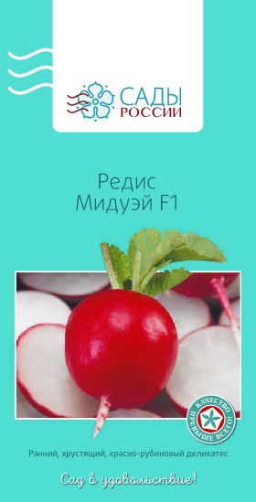 Не смотря на раннеспелость редиса в принципе, этот гибрид бьет все рекорды и подходит к уборке в самые кратчайшие сроки. Кроме того, хорошо адаптируется к различным условиям выращивания и переносит пониженные температуры, поэтому подходит для всесезонного выращивания. Корнеплоды округлой формы, выровненные по форме и размеру, насыщенно-красного цвета, диаметр 3,5 cм. Мякоть белоснежная, вкусная, не пустеет. Устойчив к стрелкованию.