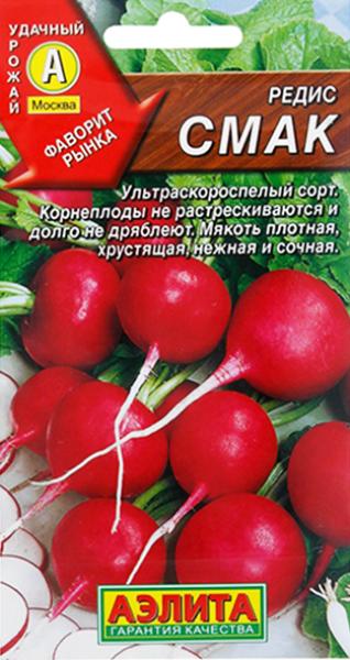 Семена Редис Смак. Ультраскороспелый сорт, лидер на рынке ранней продукции. От всходов до технической спелости 18-20 дней. Корнеплоды выравненные, массой 15-25 г, не растрескиваются и долго не дряблеют. Мякоть белая, плотная, хрустящая, нежная и сочная, с повышенным содержанием витамина С. Вкус отличный, слабоострый. Сорт устойчив к цветушности. Подходит для всех регионов. Урожайность – 1,5-2,7 кг/м2.Чтобы получать урожай в непрерывном режиме, проводят несколько посевов с интервалом 10-15 дней. Редис можно выращивать в качестве уплотняющей культуры на посадках капусты, огурцов, томатов и как повторную культуру после уборки ранних овощей.