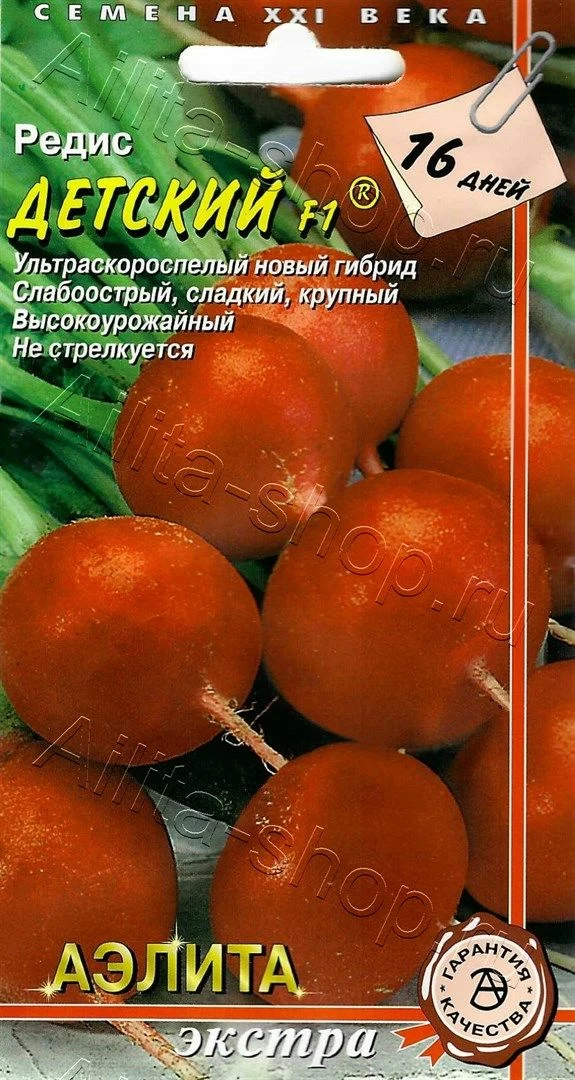 Новый  ультраскороспелый высокоурожайный гибрид. Очень устойчив к стрекованию. Рекомендуется для раннего выращивания преимущественно в открытом грунте. Корнеплод темно-красный, очень крупный, плотный, округлой формы, массой 13-22г. Мякоть белая, нежная, сочная, сладкая, слабоострая, отличных вкусовых качеств. Компания «АЭЛИТА» является эксклюзивным продавцом семян редиса сорта «Детский F1» Семена про-ва "ЗТЭК-Аэлита".