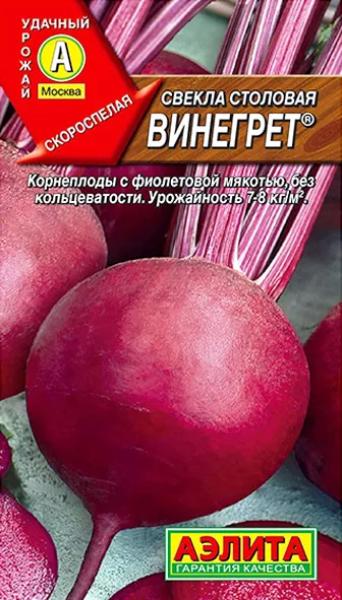 Семена Свекла Винегрет столовая. Скороспелый сорт – лидер по урожайности и качеству продукции. К уборке можно приступать уже через три месяца после посева. Корнеплоды выравненные, гладкие, среднего размера, с тонким осевым корешком. Мякоть фиолетового цвета, нежная, без колец и грубых волокон, очень сладкая (содержание сахаров 12-15 %). Подходит для получения свежего сока, консервирования, замораживания и зимнего хранения. Урожайность высокая – 6-7 кг/м2.