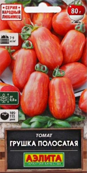 Семена Томат Грушка полосатая. Один из самых урожайных детерминантных томатов! Сорт раннеспелый – от всходов до начала сбора плодов 105-115 дней. Рекомендуется для выращивания в защищенном и открытом грунте. Высота растения в теплице до 0,8 м. Плоды нарядные и красивые, массой до 60-80 г, собраны в кисти, плотные и очень сладкие. Отлично подходят для консервирования и вяления. Урожайность в теплице 7-9 кг/м2.Рекомендуется подвязка к кольям и умеренное пасынкование. В условиях открытого грунта средней полосы в конце июля у растений прищипывают точку роста и удаляют цветущие кисти без завязей.