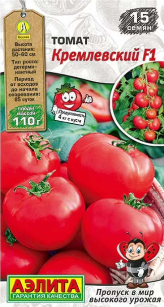 Семена Томат Кремлевский F1. Ультраскороспелый гибрид для получения сверхранней продукции в теплицах. Возможно выращивание в открытом грунте и под пленочными укрытиями с высадкой в обычные сроки. От всходов до созревания первых плодов около 85 суток. Растения детерминантные, низкорослые. Плоды* массой 100-110 г. формируются в простых кистях по 5-7 штук. Томаты средней плотности, сочные, но не водянистые. Гибрид устойчив к вертициллезу, фузариозному увяданию, ВТМ. Благо-даря раннеспелости уходит от поражения фитофторозом. Продуктивность около 4 кг с растения.