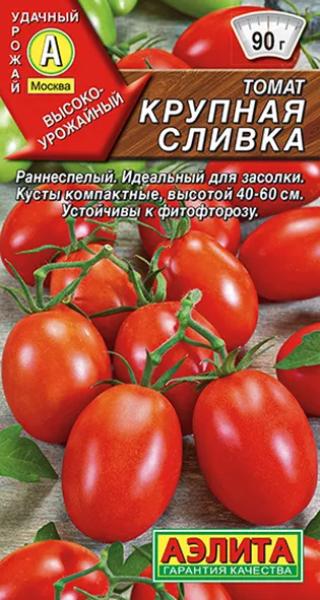 Семена Томат Крупная сливка. Высокоурожайный (6-8 кг/м2) сорт для открытого грунта. Ранний, от всходов до плодоношения 105-110 дней. Растения детерминантные, высотой до 60 см. Плоды массой 70-90 г, плотные, с высоким содержанием сухих веществ. Отличаются хорошей лежкостью. Назначение – цельноплодное консервирование и переработка на томатопродукты. Сорт устойчив к вертицеллезу и фузариозному увяданию.
