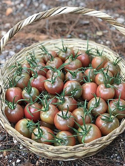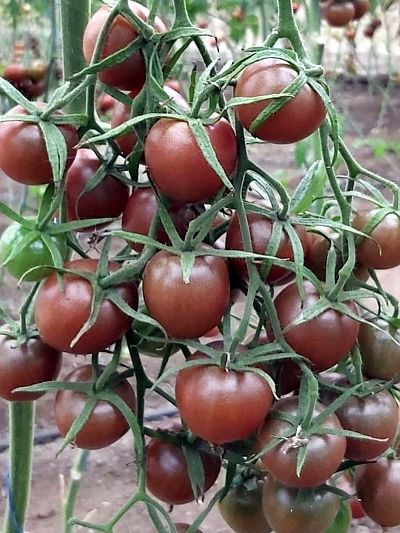 Семена Томат Мерхаба F1. Томат Мерхаба F1 - ранний, индетерминантный гибрид для выращивания во всех типах теплиц и в открытом грунте с подвязкой к опоре. От всходов до созревания плодов 95-100 дней. Растение сильнорослое, первая кисть формируется над 9-11 листом, последующие через 3 листа. Помидоры овальные, гладкие, оригинальной коричнево-бурой окраски с небольшим зелёным пятном у плодоножки, двух-трехкамерные, массой 50-70 г. Мякоть на разрезе тёмно-вишнёвого цвета. Вкус отличный. В кисти одновременно созревают 10-12 плодов. Гибрид жаростойкий и стресоустойчивый.