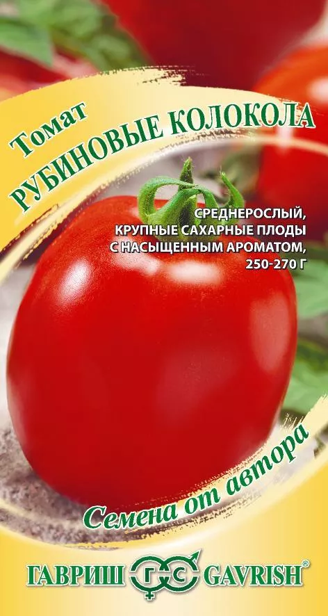 Семена Томат Рубиновые колокола. В малосолнечное дождливое лето частая жалоба агрономов — водянистый ненасыщенный вкус у томатов и плохая завязываемость плодов на растении. Сорт Рубиновые колокола устойчив к непогоде и болезням, а также имеет повышенное содержание сухих веществ и сахара в плодах. Сочетание этих качеств гарантирует высокий урожай и прекрасный вкус при любой погоде. Томат среднерослый, высотой 1,7-2,0 м, для выращивания в теплицах и открытом грунте с подвязкой к кольям. Сорт среднеранний, к сбору урожая приступают через 110-150 дней после посева. Плоды яйцевидные, необычно крупные для своей формы, массой 250-270 г каждый, отлично подойдут для салатов, приготовления томатной пасты, итальянского соуса, сока и консервирования в собственном соку. Мякоть плотная и довольно сочная, насыщенного красного цвета, с выраженным томатным вкусом и ароматом. Посев на рассаду — в марте. Пикировка — в фазе первого настоящего листа. Высадка в теплицы — в мае. В открытый грунт высаживают в мае-июне, в зависимости от региона. После высадки растение формируют, удаляя «пасынки». Семена после уборки сохраняют всхожесть в течение 10 лет при оптимальных условиях хранения. Рекомендуется увеличить норму высева по окончании срока годности.