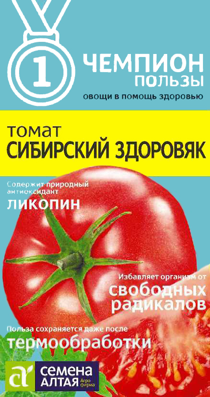 Семена Томат Сибирский здоровяк. Раннеспелый (100-110 дней) сорт. Растение индетерминантное. Плоды имеют насыщенный красный цвет. Оправдывает свое название: плоды достигают массы 500-700 г. даже при высоком урожае. Мякоть сладкая, сочная, мясистая. Отзывчив на минеральные подкормки. Интенсивно-красный цвет плодов свидетельствует о высоком содержании ликопина - природного антиоксиданта, способствующего снижению риска развития онкологических заболеваний, замедлению старения и повышению иммунитета.