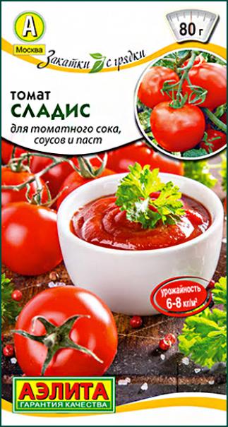 Семена Томат Сладис. Скороспелый сорт, который отлично подойдет для свежего потребления, приготовления томатного сока и различных соусов. Детерминантные крепкие растения хорошо плодоносят и в теплице (высота растений 80-90 см), и в открытом грунте и отдают урожай в ранние сроки. Красивые и вкусные плоды массой от 70 до 80 г созревают через 90-95 дней после появления всходов. Урожайность стабильная, в теплице – до 6-8 кг/м2.