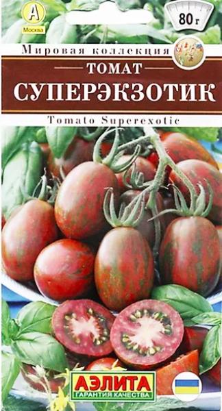 Семена Томат Суперэкзотик. Очень красивый экзотический сорт! Для защищенного и открытого грунта. Сорт любительской селекции.  Среднеспелый – от всходов до сбора первых плодов 105-115 дней. Индетерминантный, в теплице высотой до 1,8 м. Плоды сливки, массой 40-80 г, собраны в кисти по 6-15 штук в каждой. В стадии биологической спелости бордового цвета с темно-зелеными штрихами и полосками. Томаты сочные, отличного вкуса. Не растрескиваются. Замечательно выглядят в консервации, хороши для свежего потребления. Сорт устойчив к основным болезням томатов. Урожайность в теплице 10-12 кг/м2.