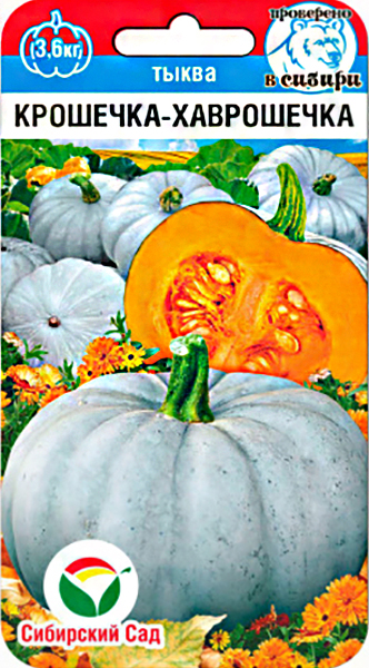 Семена тыква Крошечка-хаврошечка. Очень урожайный сорт крупноплодной тыквы. Плоды серые, округлые, слабосегментированные, массой 3-4 кг. Мякоть ярко-оранжевая, толстая, плотная, хрустящая, сладкая, с дынным ароматом.Ценность сорта: стабильная урожайность, выравненность плодов, хорошая транспортабельность и лежкость (90-100 дней). Рекомендуется для переработки и потребления в свежем виде, для приготовления детского, диетического питания и соков.Выращивается рассадным способом и прямым посевом в грунт.