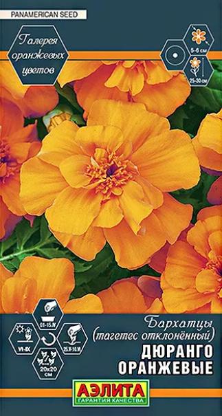 Семена Бархатцы Дюранго оранжевые. Порция хорошего настроения с оранжевыми цветами! В настоящее время модно создавать цветники, где присутствуют эффектные цветы одной окраски, например, ярко-оранжевые. Они наполняют клумбы праздничной атмосферой и создают контрастные композиции с другими растениями. Считается, если вам нравится оранжевый цвет, вас обязательно ждет успех! Пушистые аккуратные кусты, высотой 25- 30 см, отлично ветвятся, образуя множество махровых соцветий, диаметром 5-6 см. Бархатцы Дюранго созданы для разнообразных цветочных композиций, садовых вазонов и контейнеров.
