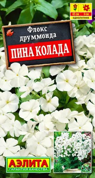 Семена Флокс Друммонда Пина Колада. Неприхотливый однолетний флокс с обильным и длительным цветением. Белоснежные цветки диаметром 2-4 см. собраны в щитковидные соцветия до 12 см в поперечнике. Цветки душистые; считается, что у белых флоксов аромат более интенсивный, чем у флоксов других расцветок. Кустики прямостоячие, раскидистые, хорошо разветвленные, высотой 35-45 см. Сорт подходит для контейнерной культуры на балконе и в саду. В цветниках открытого грунта используется для групповых и бордюрных посадок.