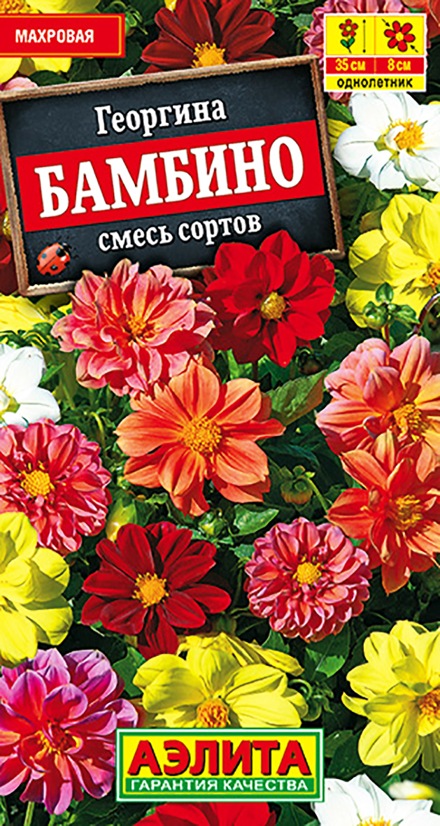 Семена Георгина Бамбино смесь окрасок. Великолепный цветок (диаметром 6-8 см) махровыми соцветиями-корзинками различных окрасок. Кусты пышные, ветвистые, высотой 35-40 см, с множеством прочных цветоносов. Цветение раннее и продолжительное, с июля до первых заморозков. Растения свето- и теплолюбивые, не выносят застоя воды в почве. Используются для групповых и одиночных посадок на клумбах и в бордюрах, подходят для выращивания в контейнерах. Агротехника. Выращивают рассадным способом с пикировкой сеянцев в фазе двух настоящих листьев. Рассаду высаживают в открытый грунт, когда минует угроза заморозков. Георгина хорошо развивается на солнечных участках с плодородными почвами. Растениям необходимы регулярные поливы, прополки, рыхления и подкормки.