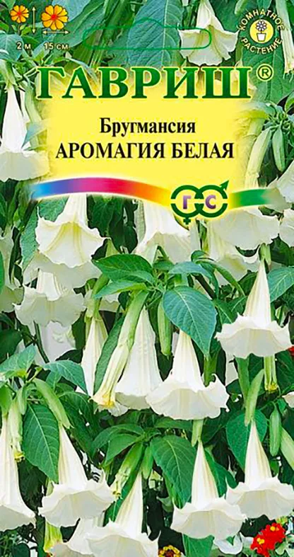 Мощное, очень красивое пышно цветущее растение из семейства Пасленовые. В умеренных широтах вырастает до 2 м. Тот, кто однажды увидит эту красавицу во время цветения, просто не сможет не влюбиться в неё. Гигантские трубчато-колокольчатые цветки достигают в длину до 30 см и в диаметре до 15 см, обладают сильным приятным ароматом, особенно в ночное время. Листья яйцевидные, достаточно крупные, длиной 20-30 см, ярко-зеленого цвета. Бругмансия хорошо переносит заморозки до -5С°, прекрасно подойдет для выращивания в кадках, которые зимой можно разместить в большом светлом помещении или зимнем саду.