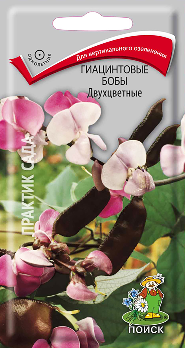 Семена Гиацинтовые Бобы Двухцветные. Великолепное, яркое, контрастное растение! Вьющийся однолетник достигает высоты 250 см. На фоне сочной зеленой листвы, бело-пурпурные цветы и темно-бордовые плоды. Цветы собраны в кистевидное соцветие длиной до 40 см, обладают слабым ароматом. Цветет в июле-сентябре. Используют для вертикального озеленения, растению необходима опора. Агротехника. Растение предпочитает открытое солнечное место. Лучше растет на легких, плодородных почвах. Семена высевают в конце апреля начале мая непосредственно на место. Расстояние между растениями 15-30 см. Глубина заделки семян 1-3 см. Нуждается в скарификации.