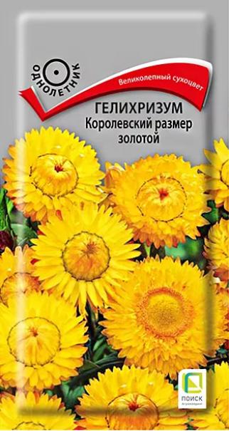 Семена Гелихризум Королевский размер золотой. Блестящие крупные цветы. Слегка раскидистый куст, достигает высоты 100 см. На каждом растении около 25 золотых соцветий диаметром 5-6 см. По краю соцветия располагаются суховатые прицветники, создающие впечатление «махровости». Цветет с августа по сентябрь.