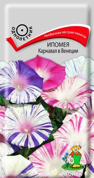 Семена Ипомея Карнавал в Венеции. Стебли достигают 2 м длины. Цветки крупные бело-голубые и бело-розовые, воронковидной формы диаметром 7-9 см. Цветет обильно с июля по октябрь. Широко используются для вертикального оформления цветников различного назначения.