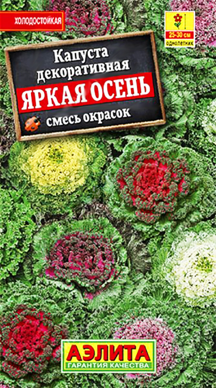 Семена Капуста декоративная Яркая осень смесь окрасок. Оригинальное по форме и окраске однолетнее травянистое растение высотой 20-30 см. Неприхотливое, холодостойкое. Листовые розетки до 30 см в диаметре расцвечивают яркими красками осенние цветники, когда летники начинают терять свою декоративность. Используется в одиночных и групповых посадках в миксбордерах и на клумбах, подходит для выращивания в крупных (не менее 10-15 л) контейнерах. Можно выращивать на “запасной” грядке, а в августе-сентябре пересадить на парадное место. Хорошо переносит пересадку с комом земли. Агротехника. Посев семян на рассаду на глубину 1 см. Пикировка в фазе семядолей. Высадка рассады в грунт со второй половины мая, через 35-40 дней, в фазе четырех-пяти настоящих листьев. Возможен посев в открытый грунт в мае.