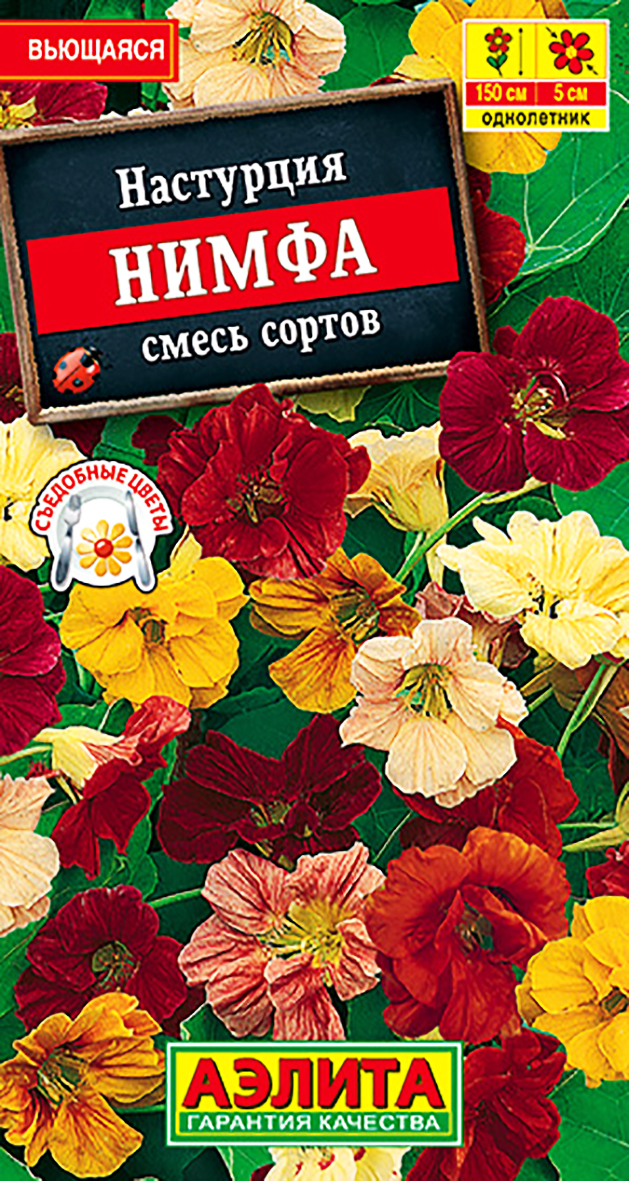 Обильноцветущая смесь настурции с плетистыми побегами длиной до двух метров. Цветки O 5 см появляются через 30-40 дней после всходов. Цветение продолжительное, с июня до первых осенних заморозков. Настурции свето- и тепло-любивые, хорошо растут в небольшом объеме земли. Отлично подходят для выращивания в различных садовых контейнерах, подвесных корзинах, на клумбах и в рабатках. Цветки и листья можно употреблять в пищу в составе салатов. Недозрелые семена используются в качестве приправы. Агротехника. Посев семян непосредственно в открытый грунт на глубину 2 см. Семена перед посевом желательно замочить. Всходы появляются через 7-10 дней. Настурция хорошо растет и цветет на легких дренированных почвах среднего плодородия. Растениям необходимы регулярные поливы, прополки, рыхления и подкормки.