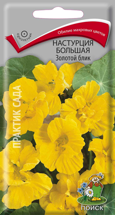 Обилие махровых цветов. Полустелющиеся побеги длиной до 1,5 м.Цветы золотисто-желтые. Шпорцы длинные, чуть изогнутые. Цветёт обильно с июня до заморозков. Используют для вертикального озеленения, балконных ящиков.