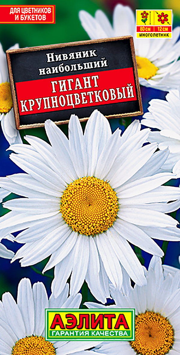 Семена Нивяник Гигант. Популярный зимостойкий многолетник с крупными соцветиями-корзинками ø 11-13 см. Стебли прямые, прочные, высотой до 80 см. Цветение обильное, продолжительное – с середины лета до заморозков. Растения неприхотливые, предпочитают солнечные места с плодородными, умеренно влажными почвами. Хорошо смотрятся в групповых посадках в цветниках, на фоне кустарников, в высоких бордюрах вдоль дорожек. Сорт дает отличный материал для срезки, соцветия стоят в воде 9-10 дней. Агротехника. Посев семян непосредственно в открытый грунт под зиму, в конце октября, или ранней весной. Возможен посев на рассаду в марте, с высадкой рассады на постоянное место в конце мая. Необходимы регулярные поливы, прополки, рыхления и подкормки. Взрослые кусты каждые 2 года рекомендуется омолаживать делением.