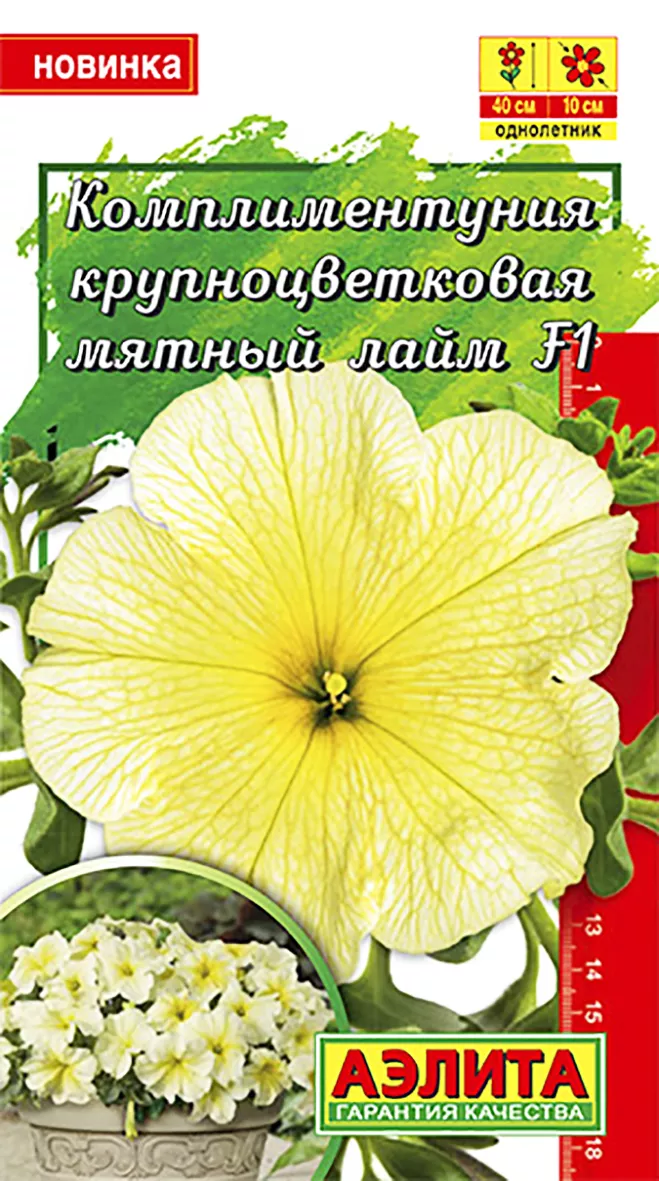 Семена Комплиментуния мятный лайм F1 крупноцветковая. Комплиментуния – стильное, эффектное и очень изящное растение, эксклюзивный гибрид (новая петуния) с крупными цветками и суперобильным цветением. Украсит любой цветник и будет долго дарить радость и восхищение. Благодаря наличию гена мужской стерильности семян не завязывает, направляя всю энергию на формирование новых цветков. Форма растений кустовая, со склонностью к трейлингу: ширина больше высоты. Высота 20-25 см., ширина 40-50 см. Быстро разрастается. Растения устойчивы к болезням, выдерживают дождливую и ветреную погоду, переносят кратковременные заморозки до –5°С и экстремальную жару до +40°С без потери декоративности.