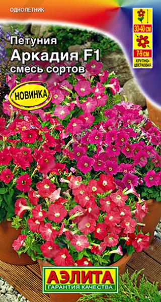 Семена Петуния Аркадия F1. Смесь крупноцветковых петуний с палитрой насыщенных розовых оттенков. Растения формируют крепкие, ветвистые кустики высотой 30-40 см. В период массового цветения растение буквально усыпано красивыми цветками диаметром 7-9 см. Цветение раннее и дружное. Смесь отлично подходит для клумб, цветников, кашпо и оформления балконных контейнеров.