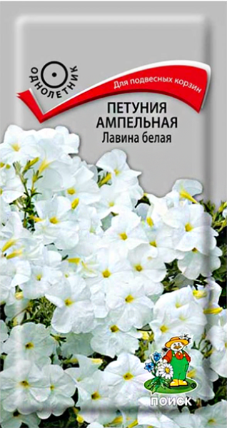 Семена Петуния Лавина белая ампельная F1. Молодые растения прямостоячие, вырастая, побеги свешиваются и образуют лавину из цветов. Цветы эффектные, воронковидные, белые. Цветет обильно с июня по октябрь. Великолепно подходит для подвесных корзин, балконных ящиков.