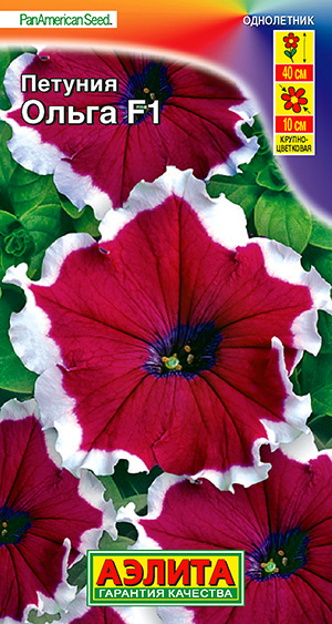 Превосходная новинка популярнейшего летника. Ее Высочество ОЛЬГА - крупноцветковая (10 см в диаметре) петуния-пикоти - выделяется бархатом глубокого бургундского оттенка в обрамлении благородного белого. Компактные кустики высотой 30 см, сплошь покрытые эффектными цветками, будут лучшим украшением Вашего цветника. Новинка великолепно подходит для оформления рабаток, бордюров, клумб, садовых контейнеров, балконных ящиков. Гибрид быстрорастущий, отличается богатством цветения, устойчивостью всего растения и отдельного цветка к дождю, ветру, перепадам температур.