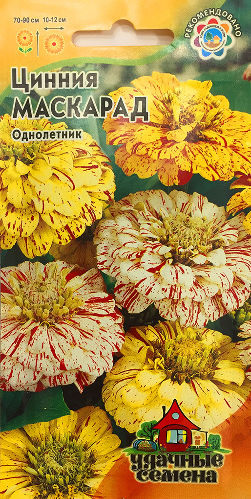 Семена Цинния Маскарад. Эффектное прямостоячее растение с прочными цветоносами высотой до 90 см. Соцветия крупные, георгиновидные, белого, желтого и кремового оттенка с оригинальным рисунком на лепестках в виде красных штрихов. Цветение обильное и продолжительное, с июня до глубокой осени. Цинния светолюбива, засухоустойчива и теплолюбива, боится заморозков. Предпочитает плодородные рыхлые почвы, обильный полив в период цветения. Выращивают рассадным и безрассадным способом. Украсит высокие цветники. В срезке долго сохраняет декоративные качества.