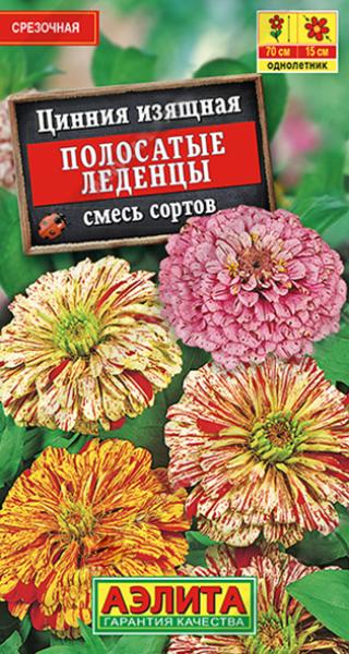 Семена Цинния Полосатые леденцы. Густая яркая штриховка лепестков напоминает праздничный салют. Ни одно соцветие не повторяется по окраске, каждое уникально. Пестрая смесь формирует растения мощные, хорошо разветвленные, высокорослые – средней высотой 70 см. Крепкие цветоносы увенчаны густомахровыми, очень крупными соцветиями диаметром 10-15 см. Растения устойчивы к жаре. Окраска не выгорает на солнце. Декоративность соцветий на кусте сохраняется 30-35 дней. Срезанные цветы стоят в воде более двух недель.