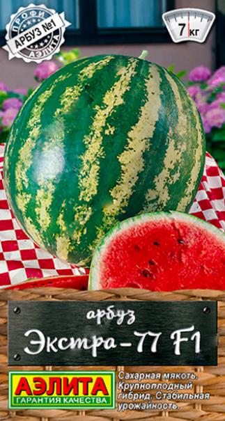 Семена Арбуз Экстра-77 F1. Серия состоит из гибридов, которые получены методом классической селекции, без генетических изменений. Среднеспелый, крупноплодный, столовый гибрид для теплиц умеренной зоны и открытого грунта южных регионов. Растения средней мощности, главная плеть длинная. Первые плоды созревают через 85-100 дней после появления всходов. Арбузы средней массой 5-7 кг, с ярко-красной, сахарной, малосемянной мякотью. Гибрид отличается стабильно высокой урожайностью, устойчивостью к фузариозу и исключительными товарными качествами.
