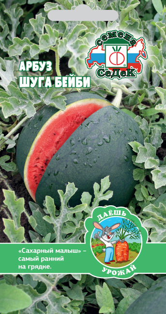 Раннеспелый (от всходов до созревания плодов 75-80 дней) урожайный сорт для открытого грунта и пленочных укрытий. Растение короткоплетистое. Плоды округлые, темно-зеленые с темными полосами, массой 3-5 кг. Мякоть насыщенно-красно-малиновая, зернистая, очень сладкая, сахарная. Семена мелкие, немногочисленные. Урожайность с растения 9-12 кг. Ценность сорта: устойчивость к антракнозу, высокое содержание сахаристости, отличная транспортабельность. Назначение универсальное.