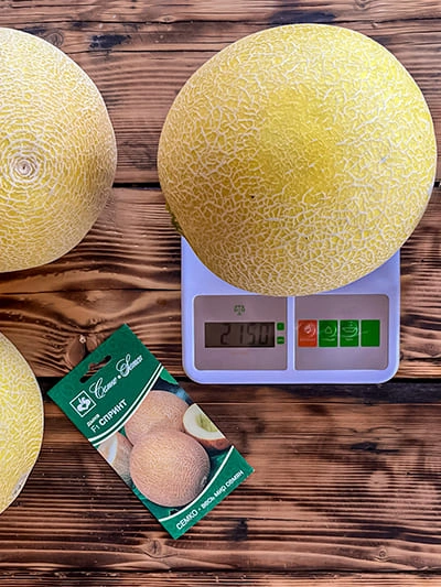 Гибрид ультраскороспелый. От всходов до первого сбора 60–65 дней. Растение среднеплетистое, лист средний, зеленый, хорошо прикрывает плоды. На растении формируется 3–6 плодов массой 1–1,2 кг. Плоды округлой формы, желто-оранжевого цвета с сеточкой по всей поверхности, не растрескивается. Мякоть толщиной 5–6 см, светло-зеленой окраски, нежная, сочная, очень сладкая и ароматная. Вкус отличный.