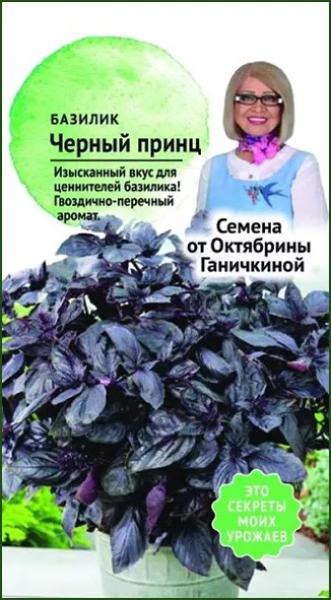 Семена Базилик «Чёрный принц» — высокоурожайный сорт с ранними сроками созревания. Масса одного растения — до 500 гр. Стебли и листья темно-фиолетовые, с ярким гвоздичным запахом. Сорт отличается крупными, яйцевидной формы листьями, густо покрывающими стебли. Используется как пряно-ароматическая добавка к салатам, вторым блюдам, при консервировании. Высокодекоративен, созревает за 47 дней.