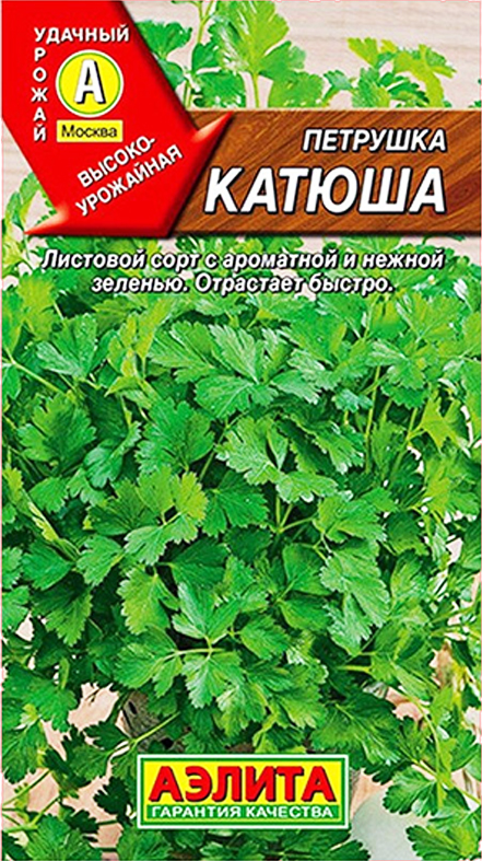 Семена Петрушка Катюша листовая. Популярный сорт с гладким листом. Среднеспелый, период от всходов до первой массовой срезки зелени 60-70 дней. Пышная розетка достигает высоты 42-52 см и массы 50 г. Нежные листья быстро отрастают после срезки. Зелень высокоароматичная, приятного пряного вкуса. При надлежащих условиях сохраняет потребительские качества 1,5-2 недели. Используется для свежего потребления, сушки, замораживания. Урожайность высокая – 3,1-3,3 кг/м 2 . Агротехника. Посев семян в открытый грунт на глубину 1 см. В фазе двух-трех настоящих листьев всходы прореживают. За лето проводят не-сколько срезок зелени, после каждой срезки растения подкармливают. Растениям необходимы регулярные поливы, прополки, рыхления. Для получения более раннего урожая возможен подзимний посев в конце октября-начале ноября.