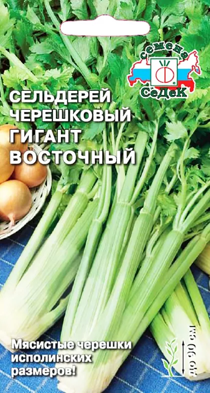 Среднеспелый (от восходов до срезки 160-180 дней) черешковый сорт. Розетка листьев мощная, прямостоячая, высотой до 90 см, массой 0,9-1,1 кг, состоящая из 13-15 листьев. Растение в целом достигает массой до 3,0 кг, мощь и размер этого исполина удивит любого огородника. Листья средние, зелёные, глянцевые. Черешки прямостоячие, крупные, толстые, длинные, длиной 50-60 см, плотно сомкнутые, светло-зелёные, сочные и ароматные, массой 700-800 г. Ценность сорта: высокая урожайность, и высокое качество, товарность и сохранность урожая после срезки.