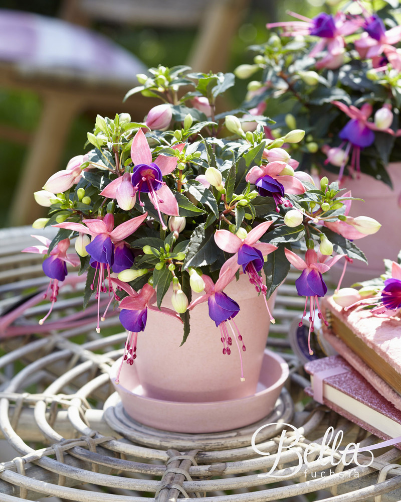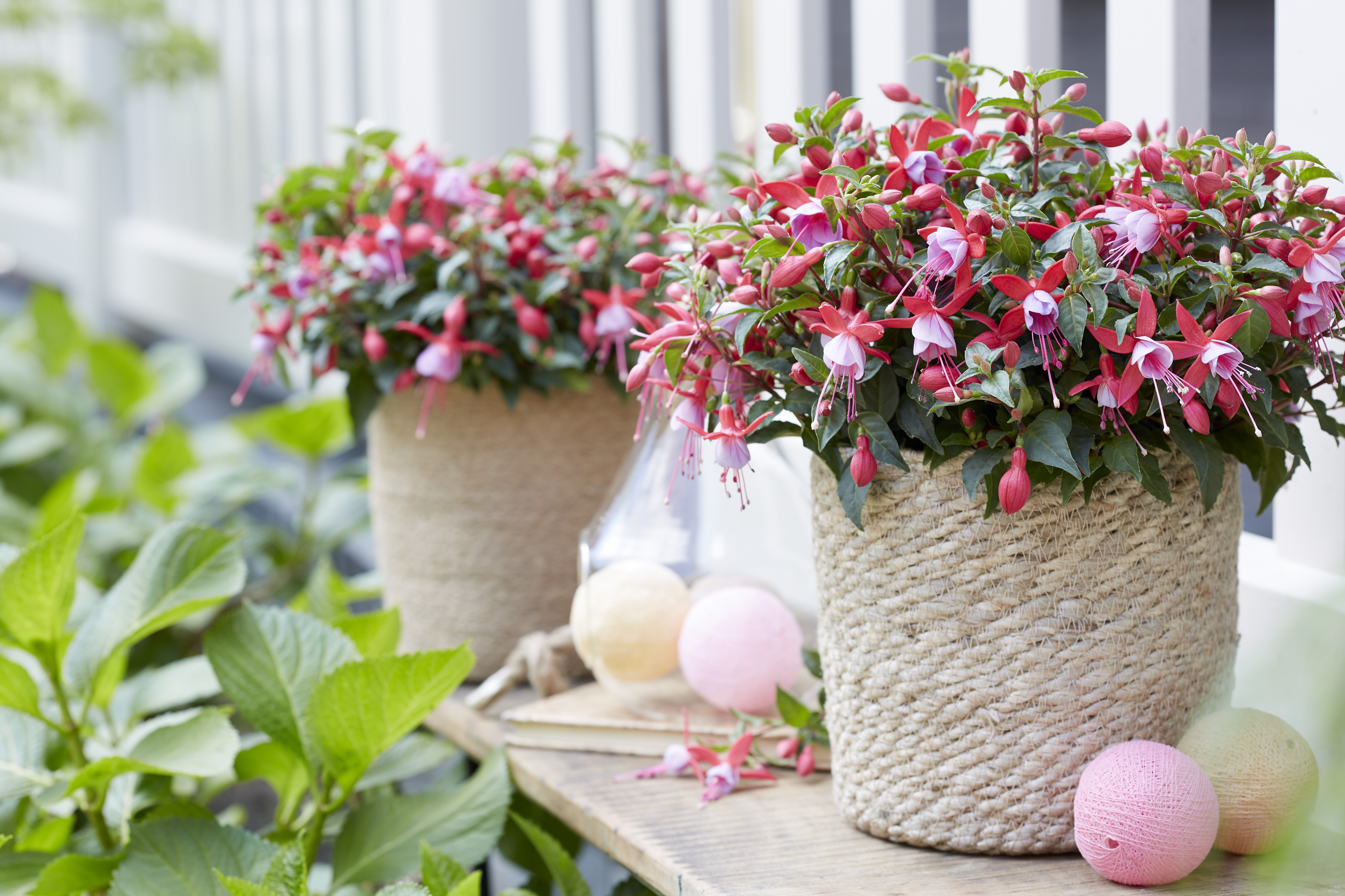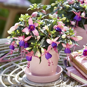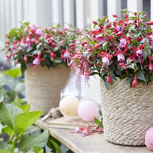 Яркие модные новинки среди прямостоячих кустовых гибридов фуксий. Габитус компактный, хорошо разветвленный. Цветки крупные, махровые, насыщенных оттенков, без устали распускаются все лето напролет. Фуксии любят воду. Если день выдался очень жарким, следите за тем, чтобы почва была влажная. При первых похолоданиях ниже +10 °С растение необходимо занести в помещение. Чтобы подготовить его к зимовке, рекомендуем постепенно сократить полив, прекратить внесение удобрений и переместить вазон с растением в прохладное помещение с температурой воздуха 10−15 °C. Если вы планируете оставить фуксию на зимовку в погребе или в гараже, можно утеплить вазон пенопластом или поставить его в ящик с опилками. К свету фуксия в этот период безразлична. Но если же оставить ее в хорошо отапливаемом помещении, то по весне буйного цветения ждать не придется. Также перед зимовкой рекомендуем обрезать растение и истребить вредителей.