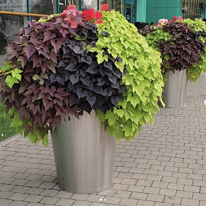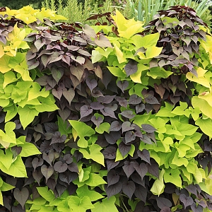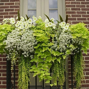 Описание композиции. Набор сочетает эффектную ипомею с крупными матовыми листьями-сердечками и лизимахию с фактурной, мерцающей на солнце листвой. Быстрый рост, активное ветвление и формирование пышных каскадов делают этот дуэт настоящим украшением любого пространства.