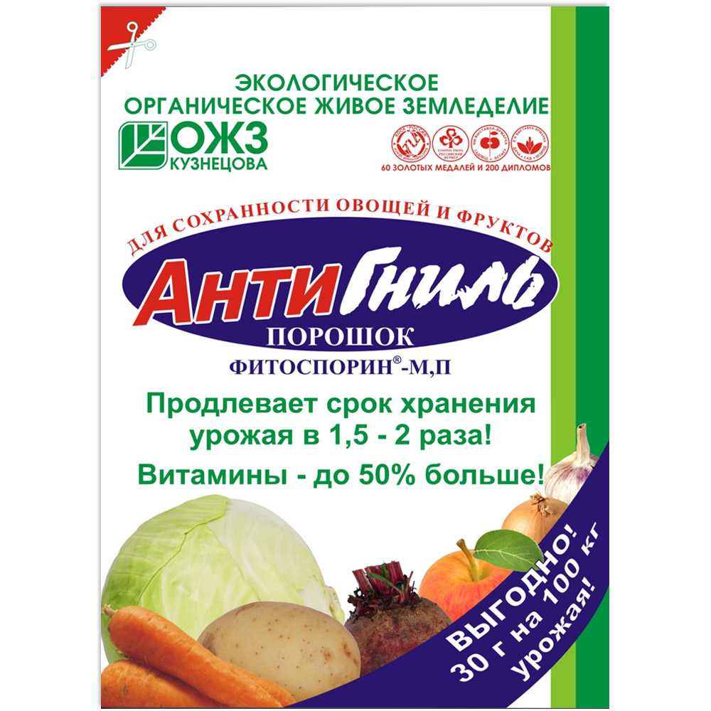 АнтиГниль не содержит химических добавок, безопасен для человека (нет срока ожидания), вы можете употреблять в пищу овощи и фрукты даже в день обработки. Опудривая порошком, можно сразу, не тратя времени на разведение, обработать урожай и место хранения (погреб, ящик и т.д.). Экономично: 30 гр. порошка на 100 кг. урожая или на обработку 10 м2 площади.