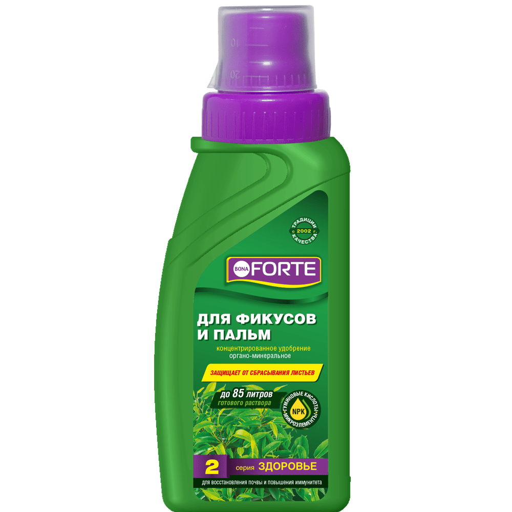 Серия ЗДОРОВЬЕ создана лабораториями Bona Forte для восстановления истощенной почвы и повышения иммунитета растений. Подходит для фикуса бенгальского, Бенджамина, Биннендийка, карики (инжира), каучуконосного, крохотного, лировидного, а также различных пальм- брахея, бутия, вашингтония, гиофорба, кариота, ливистона, финиковая, ховея, хамедорея, хризалидокарпус. Здоровье – первый и основной шаг к красоте декоративных растений. Удобрение содержит полный комплекс веществ, необходимых для полноценного и сбалансированного питания растений: