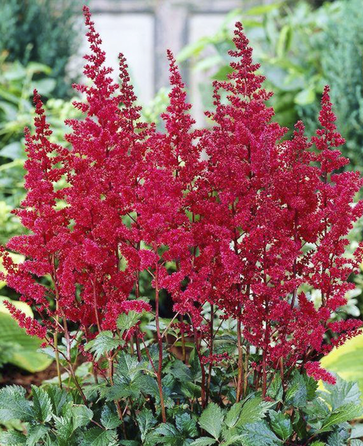 Ветвистые метельчатые соцветия могут достигать 30 см в высоту. В диаметре они обычно бывают около 12 см. Мелкие цветочки образуются на растениях в большом количестве. Насыщенный красный оттенок делает их заметными в любых садовых композициях. Обильное цветение начинается в первой половине июля и длится до сентября. Аромат цветов нежный, приятный, сладко-медовый. Астильбу Бургунди Ред часто включают в цветочные группы и миксбордеры. Этим сортом часто украшают территории рядом с кустарниками и декоративными хвойными культурами, каменистые горки, бордюры, клумбы в стиле кантри. Прекрасно данная разновидность культуры смотрится на берегах водоемов.