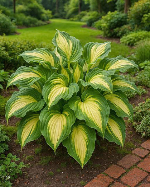 Сорт с выразительной пёстрой листвой, где на тёмно-зелёном фоне эффектно выделяются кремово-белые мазки в центре листовой пластины. Крупный куст с рифлёными листьями создаёт яркий акцент в тенистом саду.