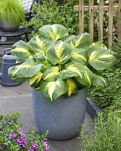Декоративный сорт хосты с элегантными сердцевидными листьями, украшенными контрастным рисунком. Листовая пластина сочетает золотисто-салатовый центр с широкой тёмно-зелёной волнистой каймой. Компактный куст сохраняет привлекательность весь сезон.