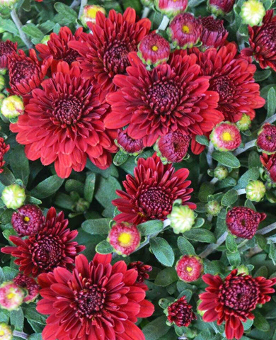 Потрясающие оттенки спелой сочной вишни или даже черешни! Они яркие, глубокие и полные энергии! На краях лепестков можно заметить тонкие желтоватые полоски, словно следы теплого солнечного света. Диаметр цветков 5–6 см. Кусты имеют густую шарообразную форму с ярко-зелеными листьями, напоминающими дубовые. Растение прекрасно смотрится как в групповых, так и в одиночных посадках. Не боится первых морозов и отлично переносит зиму без укрытия.