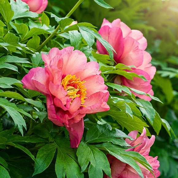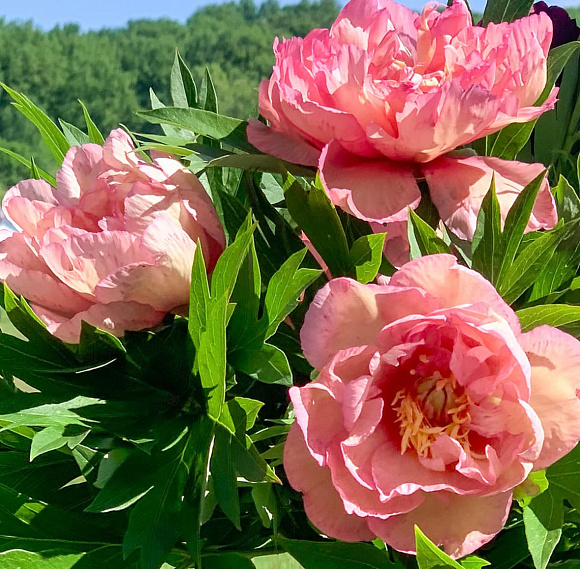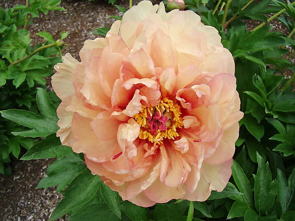 Элитный ИТО-гибрид с крупными махровыми цветками в потрясающей сливочно-желтой гамме. По волнистым лепесткам расходятся розовые, персиковые и насыщенно-вишневые пятна. По мере распускания цветок меняется, становится еще интереснее по тону и привлекает внимание сложной, живой окраской. На одном взрослом кусте за лето появляется от 50 до 80 бутонов! Цветение продолжается около трех недель. Куст плотный, округлый, с прочными стеблями и густой темно-зеленой листвой. Сорт устойчив к заболеваниям. Зимостойкость до −37 °C.