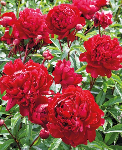 Травянистый пион с роскошными махровыми цветами насыщенного рубинового оттенка с выраженным атласным блеском. В центре цветка контрастно выделяются золотистые тычинки. К концу цветения лепестки приобретают оригинальный шоколадно-коричневый оттенок. Каждый прочный стебель несет до 3 бутонов, обеспечивая продолжительное цветение.