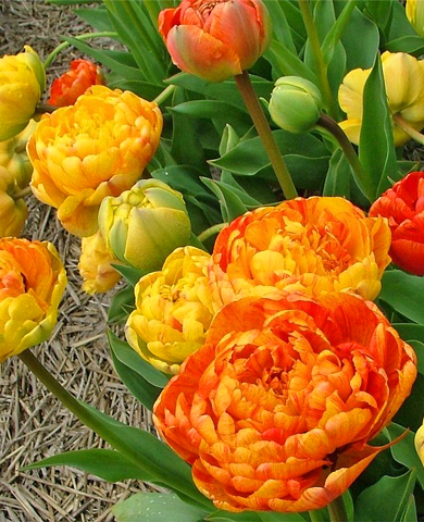 Пылающее завершение весеннего цветочного парада. Его густомахровые соцветия словно сотканы из языков пламени: лепестки переливаются золотыми, медными и алыми оттенками, меняя тон в зависимости от освещения и степени раскрытия. Объемные, многослойные, они выглядят по-настоящему торжественно. Цветет в конце мая, становится яркой финальной нотой в саду.
