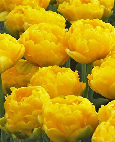 Золотисто-желтые цветки этого тюльпана словно несут с собой свет. Пышные махровые лепестки многослойны и при всей своей воздушности отличаются прочностью и упругостью. Соцветия долго сохраняют форму и насыщенность цвета, радуя глаз до самого конца цветения.